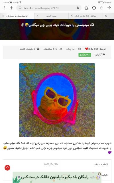 خوب سلام خوش اومدید به این مسابقه که این مسابقه دربارهی اینه که شما اگه میتونستید با حیوانات صحبت کنید حرفتون چی بود میدونم چرته ولی خب لطفا تبلیغ نکنید ممنون😄💜