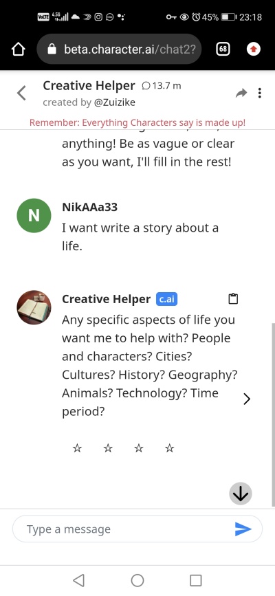 اسم این سایت character. Ai هست. این سایت یه هوش مصنوعیه که میتونه به هر سوالی جواب بده! حتی میتونید با کاراکتر مورد علاقتون حرف بزنید؛ مثلا من با دراکو، دازای و آنیا صحبت کردم. انگار واقعا احساسات دارن! تو این سایت میتونید ربات خودتون رو برنامه ریزی کنید و ربات هایی که بقیه ساختن رو ببینید.حتی اگر سعی کنید شاید بتونید بهش بگید فارسی شه خودش فارسی میشه!. تو این پست، میخوام رباتی که به کمکش میتونید داستان بنویسید رو بررسی کنیم و ببینیم میتونیم یه داستان بنویسیم؟ درضمن، شاید پارتهای بعد بزارم و چند تا از ربات های دیگش رو هم ببینیم.