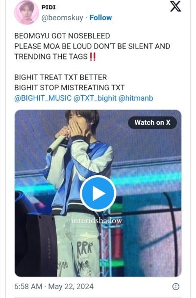 یکی از دلایل خون دماغ شدند استرس است ترجمه: بومگیو خون دماغ شده لطفا موآ بلند باشید ساکت نباشید و تگهارو ترند کنید‼ BIGHIT TREAT TXT BETTER (بیگ هیت با TXT بهتر رفتار کن) BIGHIT STOP MISTREATING TXT(بیگ هیت بدرفتاری با TXT را تمام کن)