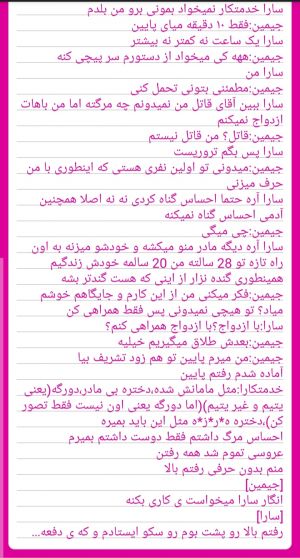 (نوشته عکس){من سارام سارای بدبخت کخ قراره با بزرگترین و بدترین مافیای شهر ازدواج کنم،البته من دوستش ندارم به زور دارم ازدواج میکنم بابام منو مجبور کرده........سارا:بابا میدونی که من اونو دوست ندارم میدونی که نمیخوام ازدواج کنم هنوز خیلی بچه ام هنوز 20 سالمه_____________بابای سارا:خب به اندازه کافی بزرگی تو ازدواج میکنی نه چرا و چون نیست_________سارا:بابا لطفا میدونی که من از اون بدم میاد_________بابای سارا:خدمتکارا خدمتکارا بیاید ببریدش(مگه گروگانه که ببرنش؟)بیرون میدونی اصلا تو ازدواج نکن چه ضرری بهم میرسه ببین اون بزرگترین و بزرگترین باند مافیا(نمیدونم چرا این داستانا مد شده همه مافیان منم گفتم ی امتحانی کنم😂🙂)رو داره پس اگه منو اون با هم باشیم بزرگتر میشه میدونی همه مافیا زیر دستشن هان پس کاری نکن که به ضرر ما تموم بشه–_–_–_–فهمیدیددلتونبه حالم میسوزه حالا اما میخوام فرار کنم امروز عروسیه منم تو اتاق باید آماده بشم اما میخوام فرار کنم رو مچ دستم یکم خون انداختم بعد خودمو مثل اینکه خودکشی کردم در آوردم ____خدمتکار:خانم خانم.....آقا آقا دخترتون خودکشی کردن}